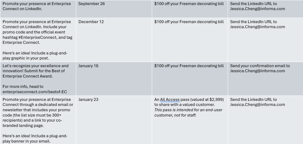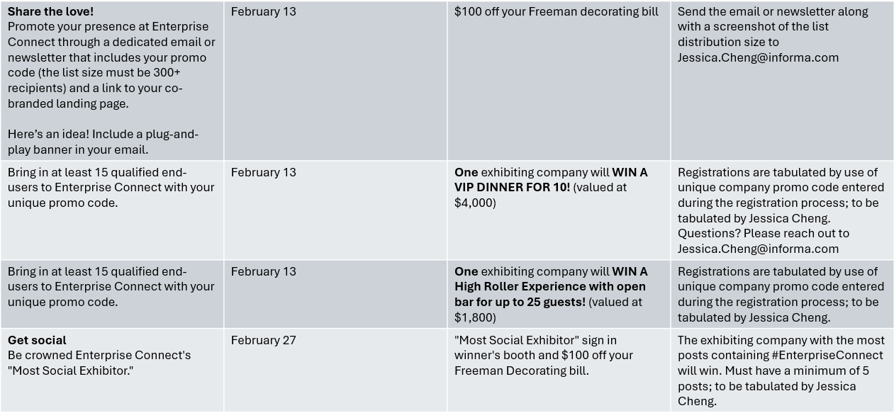 - Enterprise Connect will provide the promo code usage list–winning exhibitor is responsible for the guest list and RSVPS.