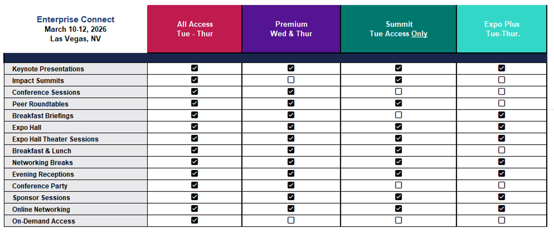 - The event organizers reserve the right to refuse Expo Plus and/or On-Demand pass applications from representatives of companies that compete with official Enterprise Connect Sponsors and Exhibitors. If you would like to become an exhibitor, please learn more about our available Sponsor & Exhibit Opportunities.